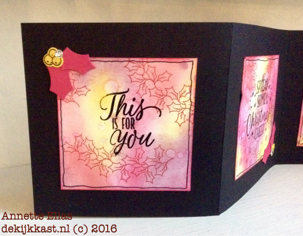 De kleuren komen terug in de "Holly" decoratie op de hoekjes. Lekker bont zo ;o) Dit heb ik gedaan met de Holly Berry Builder pons. Ik heb er voor gekozen alleen de besjes te stempelen, en de blaadjes alleen uit te ponsen.