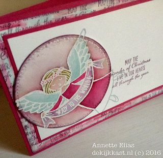 De schattige engelenstempel is heerlijk om in te kleuren. Met Aquarel krijg je snel lieve kleurtjes. Door de afdruk te embossen met Whisper White Embossingpoeder is dat nog makkelijker. Je blijft dan veel makkelijker "binnen de lijntjes".