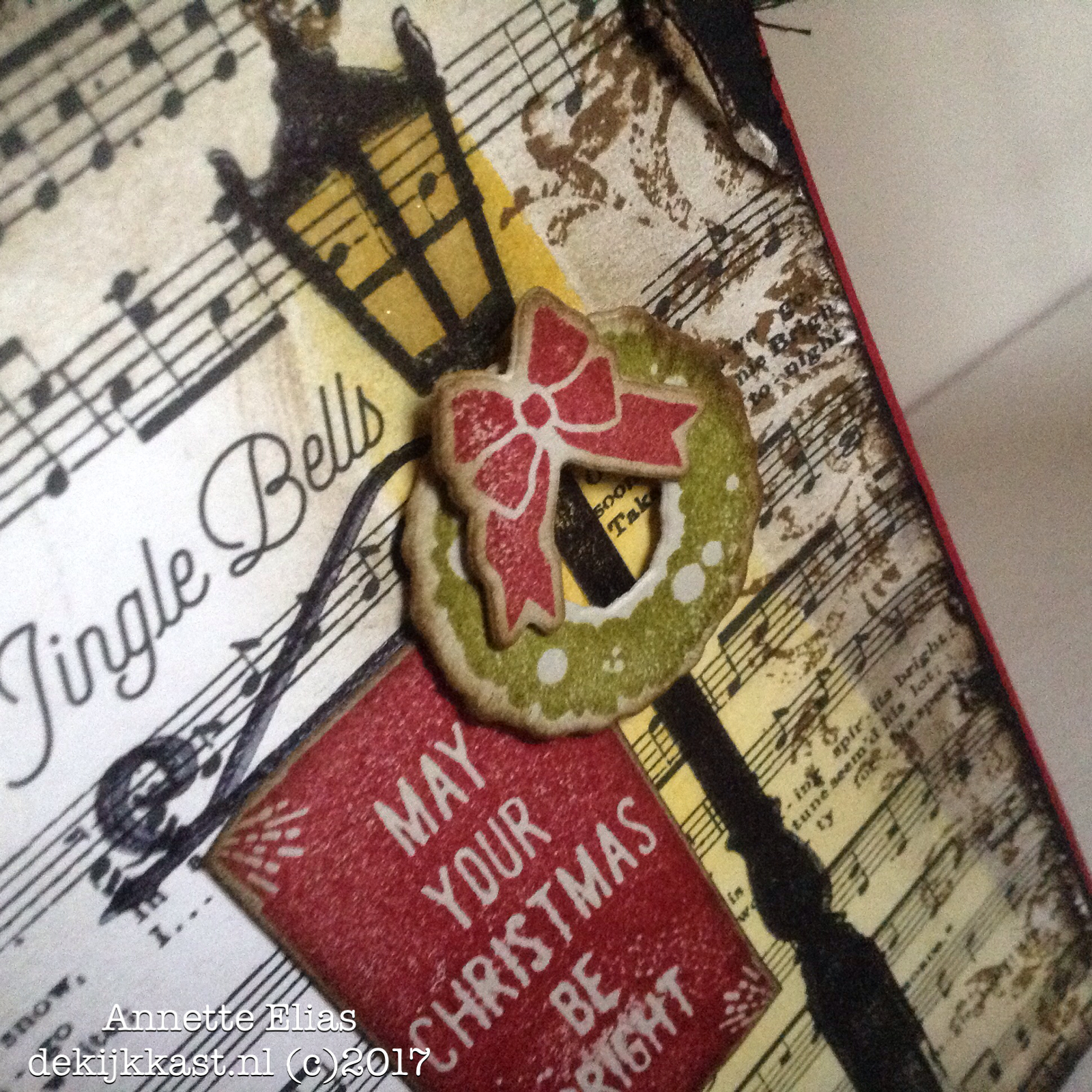 De ondergrond bestaat uit een stukje Merry Music Designer Series Paper. Dit heb ik flink bewerkt. Het is eigenlijk helder wit papier met zwarte opdruk, maar met veel sponzen, stempelen met Timeless Textures en het distressen van de randen heeft het een gave "oude"look gekregen.