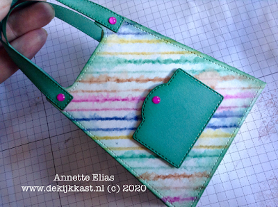 Met de All Dressed Up Dies maakte ik van dit papier een vrolijk tasje. Met Just Jade cardstock maakte ik de accenten.