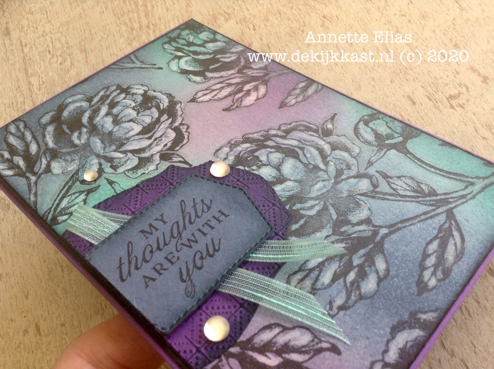 Ik begon met een stukje Shimmery White Cardstock dat ik met Stampin'Sponges en drie kleuren inkt voorzag van kleuren, die mooi in elkaar overlopen. Hierop stempelde ik meerdere keren de grote Peony/pioenroos stempel met Black Stazon inkt.