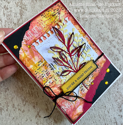 Met de supergave "gescheurde randjesstans" in de set maakte ik de laagjes mooi duidelijk. Dit liet ik ook in de linker bovenhoek van de kaart terugkomen. Dit geeft lekker veel pit aan de kaart waardoor het geel met rood extra gaat spreken.