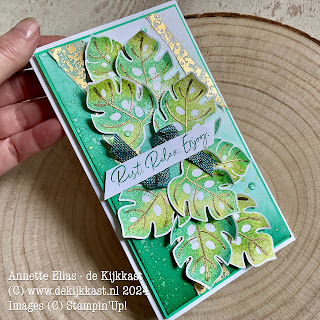 BeantwoordenVerwijderenMooi gedaan met die tropische blaadjes, prachtige geblende achtergrond, en heerlijk dat goud er een beetje tussendoor….en nu wegdromen onder dat tropische bladerdak. Kortom mooie kaarten met mooie techniekjes.