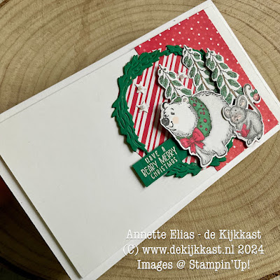 Het gebruikte designpapier komt uit het Take A Bow DSP waar allerlei leuke kleine kerstige printjes in zitten, dus hier combineerde ik de streepjes met de stipjes, allebei in het rood.