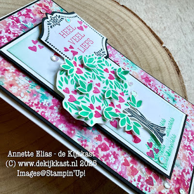 Wat denk je bijvoorbeeld van deze lieve hartjesboom? De set Pick a Season is superleuk om allerlei van dit soort leuke bomen te maken. In de openingen van het bladerdek, kun je elke keer iets anders stempelen. De vorige keer (deze kaart vind je HIER) koos ik voor bloemen, en deze keer koos ik voor de hartjes!